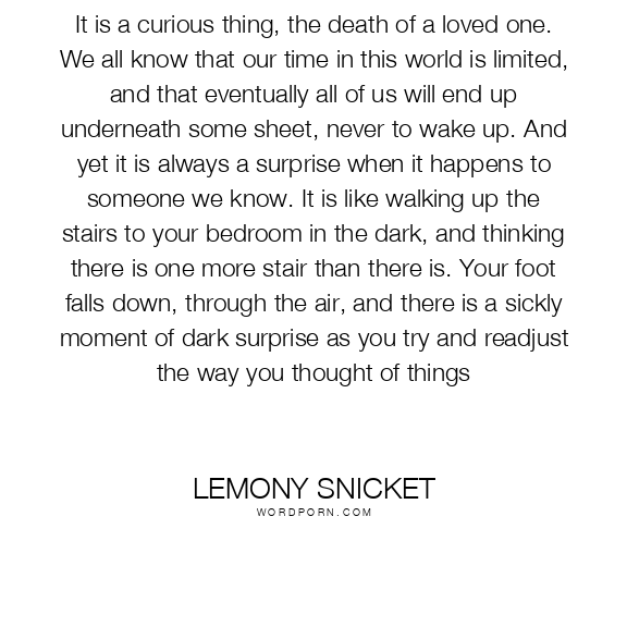 It is a curious thing, the death of a loved one. We all know that our time in this world is limited, and that eventually all of us will end up underneath some sheet, never to wake up. And yet it is always a surprise when it happens to someone we know. It is like walking up the stairs to your bedroom in the dark, and thinking there is one more stair than there is. Your foot falls down, through the air, and there is a sickly moment of dark surprise as you try and readjust the way you thought of things