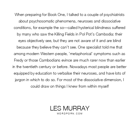 When preparing for Book One, I talked to a couple of psychiatrists about psychosomatic phenomena, neuroses and dissociative conditions, for example the so—called hysterical blindness suffered by many who saw the Killing Fields in Pol Pot’s Cambodia: their eyes objectively see, but they are not aware of it and are blind because they believe they can’t see. One specialist told me that among modern Western people, ’metaphorical’ symptoms such as Fredy or those Cambodians evince are much rarer now than earlier in the twentieth century or before. Nowadays most people are better equipped by education to verbalise their neuroses, and have lots of jargon in which to do so. For most of the dissociative dimension, I could draw on things I knew from within myself