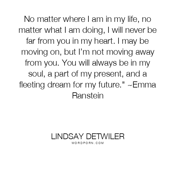 No matter where I am in my life, no matter what I am doing, I will never be far from you in my heart. I may be moving on, but I’m not moving away from you. You will always be in my soul, a part of my present, and a fleeting dream for my future." ~Emma Ranstein