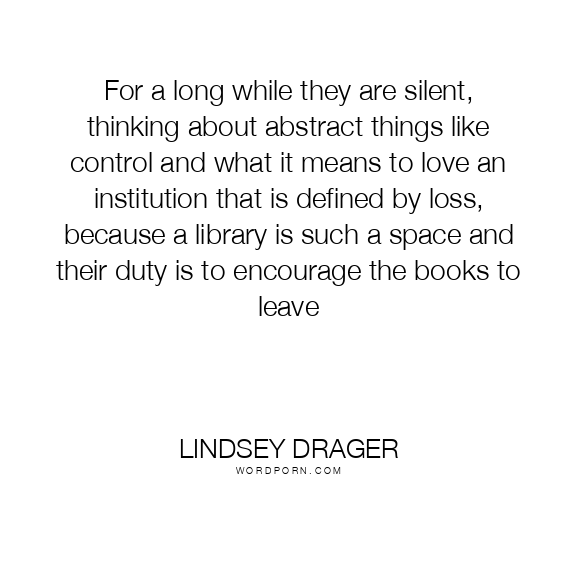 For a long while they are silent, thinking about abstract things like control and what it means to love an institution that is defined by loss, because a library is such a space and their duty is to encourage the books to leave