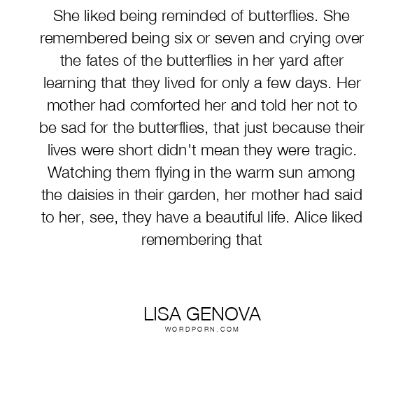 She liked being reminded of butterflies. She remembered being six or seven and crying over the fates of the butterflies in her yard after learning that they lived for only a few days. Her mother had comforted her and told her not to be sad for the butterflies, that just because their lives were short didn't mean they were tragic. Watching them flying in the warm sun among the daisies in their garden, her mother had said to her, see, they have a beautiful life. Alice liked remembering that