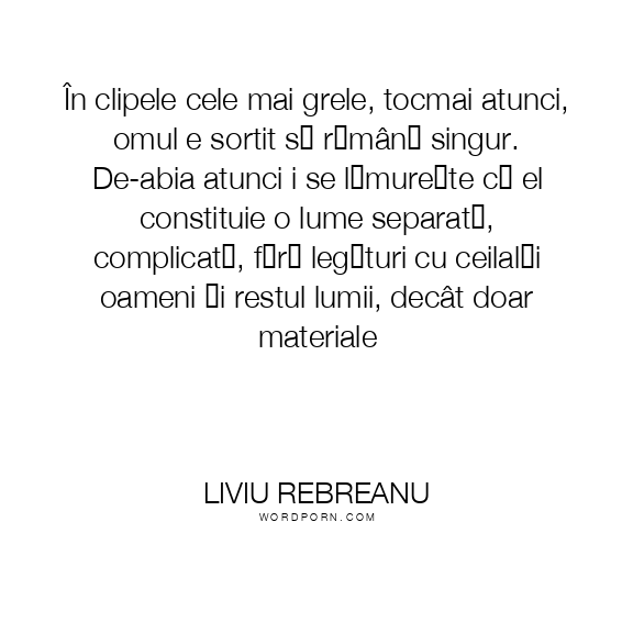 În clipele cele mai grele, tocmai atunci, omul e sortit să rămână singur. De-abia atunci i se lămurește că el constituie o lume separată, complicată, fără legături cu ceilalți oameni și restul lumii, decât doar materiale