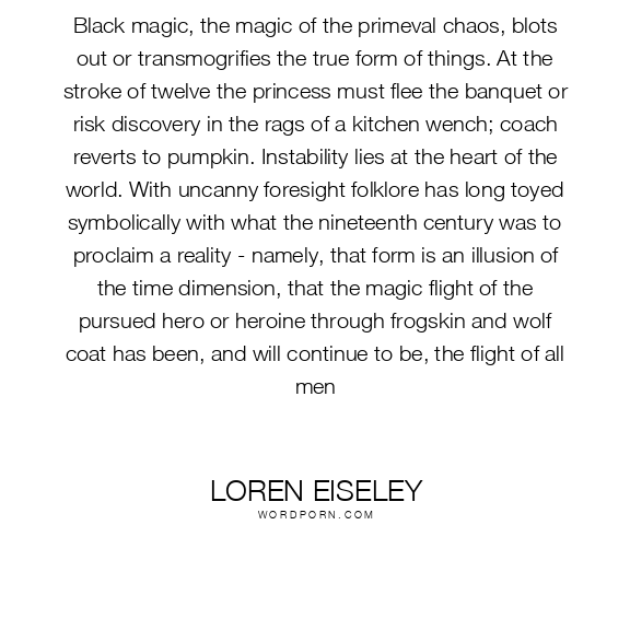 Black magic, the magic of the primeval chaos, blots out or transmogrifies the true form of things. At the stroke of twelve the princess must flee the banquet or risk discovery in the rags of a kitchen wench; coach reverts to pumpkin. Instability lies at the heart of the world. With uncanny foresight folklore has long toyed symbolically with what the nineteenth century was to proclaim a reality - namely, that form is an illusion of the time dimension, that the magic flight of the pursued hero or heroine through frogskin and wolf coat has been, and will continue to be, the flight of all men