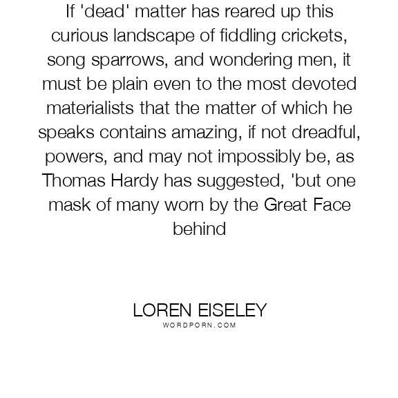 If 'dead' matter has reared up this curious landscape of fiddling crickets, song sparrows, and wondering men, it must be plain even to the most devoted materialists that the matter of which he speaks contains amazing, if not dreadful, powers, and may not impossibly be, as Thomas Hardy has suggested, 'but one mask of many worn by the Great Face behind
