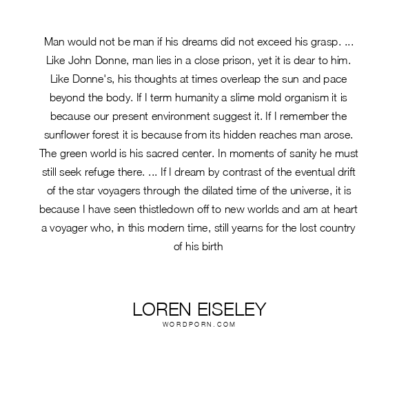 Man would not be man if his dreams did not exceed his grasp. ... Like John Donne, man lies in a close prison, yet it is dear to him. Like Donne's, his thoughts at times overleap the sun and pace beyond the body. If I term humanity a slime mold organism it is because our present environment suggest it. If I remember the sunflower forest it is because from its hidden reaches man arose. The green world is his sacred center. In moments of sanity he must still seek refuge there. ... If I dream by contrast of the eventual drift of the star voyagers through the dilated time of the universe, it is because I have seen thistledown off to new worlds and am at heart a voyager who, in this modern time, still yearns for the lost country of his birth