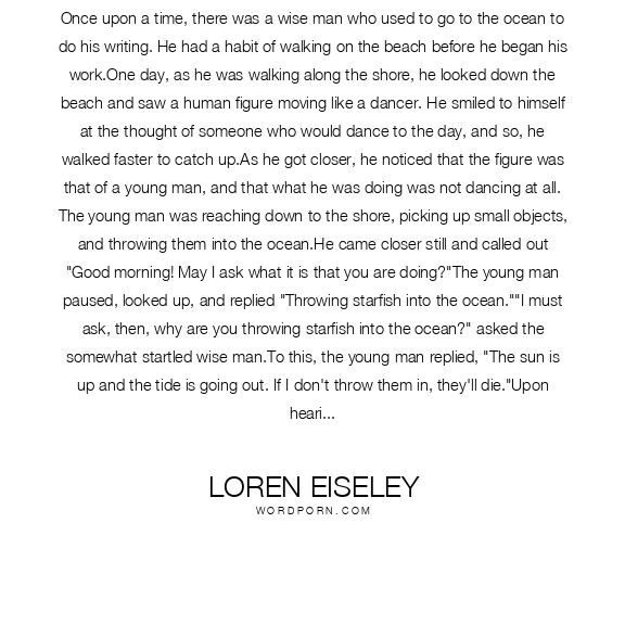 Once upon a time, there was a wise man who used to go to the ocean to do his writing. He had a habit of walking on the beach before he began his work.One day, as he was walking along the shore, he looked down the beach and saw a human figure moving like a dancer. He smiled to himself at the thought of someone who would dance to the day, and so, he walked faster to catch up.As he got closer, he noticed that the figure was that of a young man, and that what he was doing was not dancing at all. The young man was reaching down to the shore, picking up small objects, and throwing them into the ocean.He came closer still and called out "Good morning! May I ask what it is that you are doing?"The young man paused, looked up, and replied "Throwing starfish into the ocean.""I must ask, then, why are you throwing starfish into the ocean?" asked the somewhat startled wise man.To this, the young man replied, "The sun is up and the tide is going out. If I don't throw them in, they'll die."Upon hearing this, the wise man commented, "But, young man, do you not realize that there are miles and miles of beach and there are starfish all along every mile? You can't possibly make a difference!"At this, the young man bent down, picked up yet another starfish, and threw it into the ocean. As it met the water, he said, "It made a difference for that one