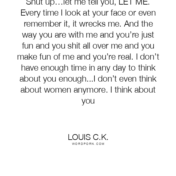 Shut up…let me tell you, LET ME. Every time I look at your face or even remember it, it wrecks me. And the way you are with me and you’re just fun and you shit all over me and you make fun of me and you’re real. I don’t have enough time in any day to think about you enough...I don’t even think about women anymore. I think about you