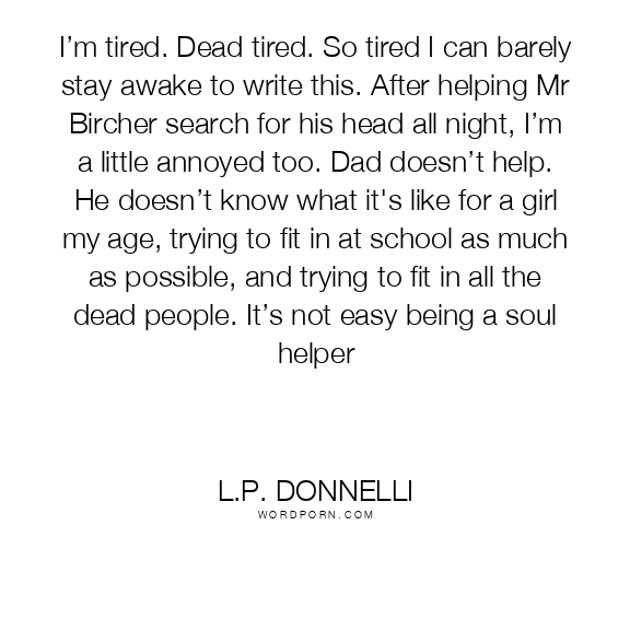 I’m tired. Dead tired. So tired I can barely stay awake to write this. After helping Mr Bircher search for his head all night, I’m a little annoyed too. Dad doesn’t help. He doesn’t know what it's like for a girl my age, trying to fit in at school as much as possible, and trying to fit in all the dead people. It’s not easy being a soul helper
