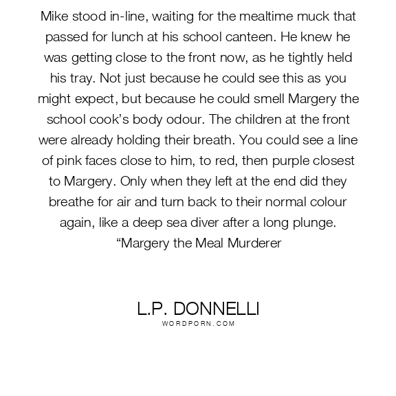 Mike stood in-line, waiting for the mealtime muck that passed for lunch at his school canteen. He knew he was getting close to the front now, as he tightly held his tray. Not just because he could see this as you might expect, but because he could smell Margery the school cook’s body odour. The children at the front were already holding their breath. You could see a line of pink faces close to him, to red, then purple closest to Margery. Only when they left at the end did they breathe for air and turn back to their normal colour again, like a deep sea diver after a long plunge. “Margery the Meal Murderer