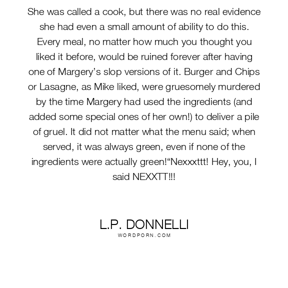 She was called a cook, but there was no real evidence she had even a small amount of ability to do this. Every meal, no matter how much you thought you liked it before, would be ruined forever after having one of Margery’s slop versions of it. Burger and Chips or Lasagne, as Mike liked, were gruesomely murdered by the time Margery had used the ingredients (and added some special ones of her own!) to deliver a pile of gruel. It did not matter what the menu said; when served, it was always green, even if none of the ingredients were actually green!“Nexxxttt! Hey, you, I said NEXXTT!!!
