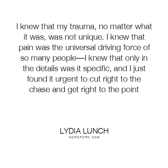 I knew that my trauma, no matter what it was, was not unique. I knew that pain was the universal driving force of so many people—I knew that only in the details was it specific, and I just found it urgent to cut right to the chase and get right to the point
