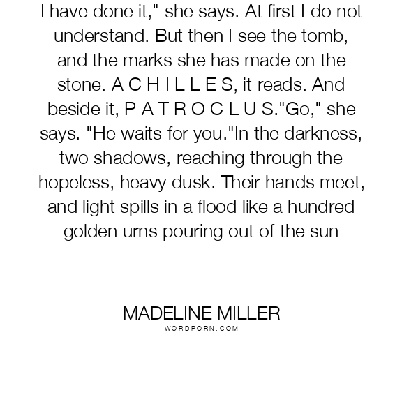 I have done it," she says. At first I do not understand. But then I see the tomb, and the marks she has made on the stone. A C H I L L E S, it reads. And beside it, P A T R O C L U S."Go," she says. "He waits for you."In the darkness, two shadows, reaching through the hopeless, heavy dusk. Their hands meet, and light spills in a flood like a hundred golden urns pouring out of the sun