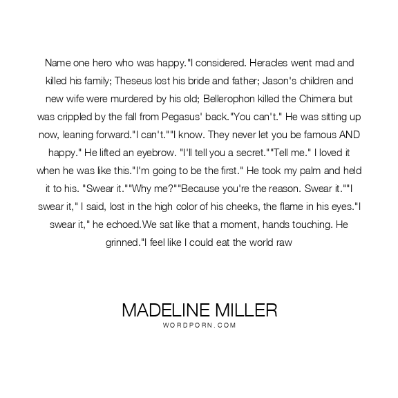 Name one hero who was happy."I considered. Heracles went mad and killed his family; Theseus lost his bride and father; Jason's children and new wife were murdered by his old; Bellerophon killed the Chimera but was crippled by the fall from Pegasus' back."You can't." He was sitting up now, leaning forward."I can't.""I know. They never let you be famous AND happy." He lifted an eyebrow. "I'll tell you a secret.""Tell me." I loved it when he was like this."I'm going to be the first." He took my palm and held it to his. "Swear it.""Why me?""Because you're the reason. Swear it.""I swear it," I said, lost in the high color of his cheeks, the flame in his eyes."I swear it," he echoed.We sat like that a moment, hands touching. He grinned."I feel like I could eat the world raw