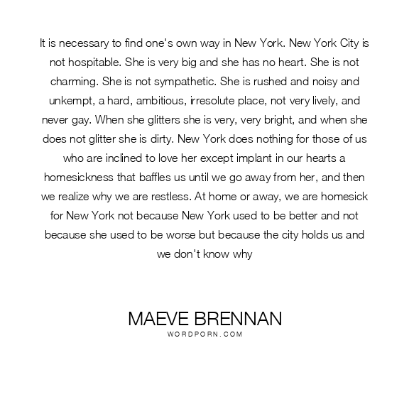 It is necessary to find one's own way in New York. New York City is not hospitable. She is very big and she has no heart. She is not charming. She is not sympathetic. She is rushed and noisy and unkempt, a hard, ambitious, irresolute place, not very lively, and never gay. When she glitters she is very, very bright, and when she does not glitter she is dirty. New York does nothing for those of us who are inclined to love her except implant in our hearts a homesickness that baffles us until we go away from her, and then we realize why we are restless. At home or away, we are homesick for New York not because New York used to be better and not because she used to be worse but because the city holds us and we don't know why