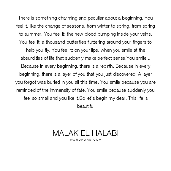 There is something charming and peculiar about a beginning. You feel it, like the change of seasons, from winter to spring, from spring to summer. You feel it; the new blood pumping inside your veins. You feel it; a thousand butterflies fluttering around your fingers to help you fly. You feel it; on your lips, when you smile at the absurdities of life that suddenly make perfect sense.You smile... Because in every beginning, there is a rebirth. Because in every beginning, there is a layer of you that you just discovered. A layer you forgot was buried in you all this time. You smile because you are reminded of the immensity of fate. You smile because suddenly you feel so small and you like it.So let's begin my dear. This life is beautiful