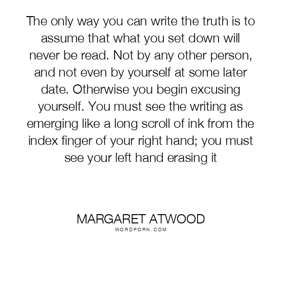 The only way you can write the truth is to assume that what you set down will never be read. Not by any other person, and not even by yourself at some later date. Otherwise you begin excusing yourself. You must see the writing as emerging like a long scroll of ink from the index finger of your right hand; you must see your left hand erasing it