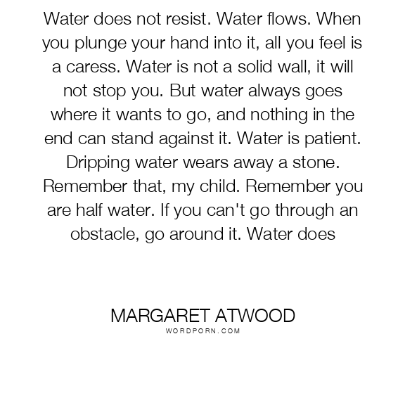 Water does not resist. Water flows. When you plunge your hand into it, all you feel is a caress. Water is not a solid wall, it will not stop you. But water always goes where it wants to go, and nothing in the end can stand against it. Water is patient. Dripping water wears away a stone. Remember that, my child. Remember you are half water. If you can't go through an obstacle, go around it. Water does