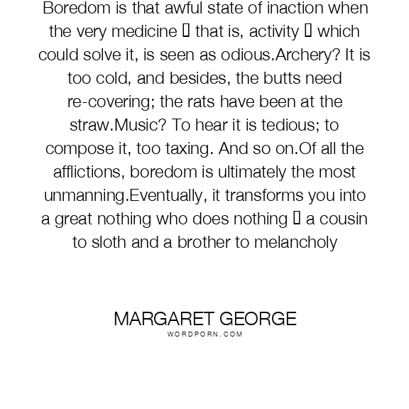 Boredom is that awful state of inaction when the very medicine ― that is, activity ― which could solve it, is seen as odious.Archery? It is too cold, and besides, the butts need re-covering; the rats have been at the straw.Music? To hear it is tedious; to compose it, too taxing. And so on.Of all the afflictions, boredom is ultimately the most unmanning.Eventually, it transforms you into a great nothing who does nothing ― a cousin to sloth and a brother to melancholy