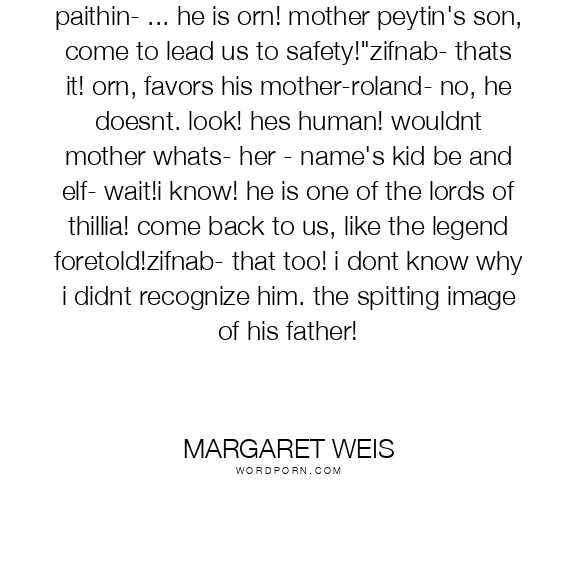 paithin- ... he is orn! mother peytin's son, come to lead us to safety!"zifnab- thats it! orn, favors his mother-roland- no, he doesnt. look! hes human! wouldnt mother whats- her - name's kid be and elf- wait!i know! he is one of the lords of thillia! come back to us, like the legend foretold!zifnab- that too! i dont know why i didnt recognize him. the spitting image of his father!