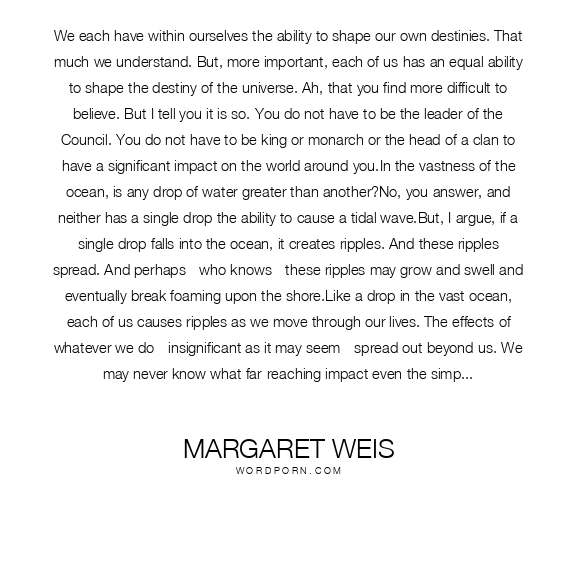 We each have within ourselves the ability to shape our own destinies. That much we understand. But, more important, each of us has an equal ability to shape the destiny of the universe. Ah, that you find more difficult to believe. But I tell you it is so. You do not have to be the leader of the Council. You do not have to be king or monarch or the head of a clan to have a significant impact on the world around you.In the vastness of the ocean, is any drop of water greater than another?No, you answer, and neither has a single drop the ability to cause a tidal wave.But, I argue, if a single drop falls into the ocean, it creates ripples. And these ripples spread. And perhaps - who knows - these ripples may grow and swell and eventually break foaming upon the shore.Like a drop in the vast ocean, each of us causes ripples as we move through our lives. The effects of whatever we do - insignificant as it may seem - spread out beyond us. We may never know what far-reaching impact even the simplest action might have on our fellow mortals. Thus we need to be conscious, all of the time, of our place in the ocean, of our place in the world, of our place among our fellow creatures.For if enough of us join forces, we can swell the tide of events - for good or for evil