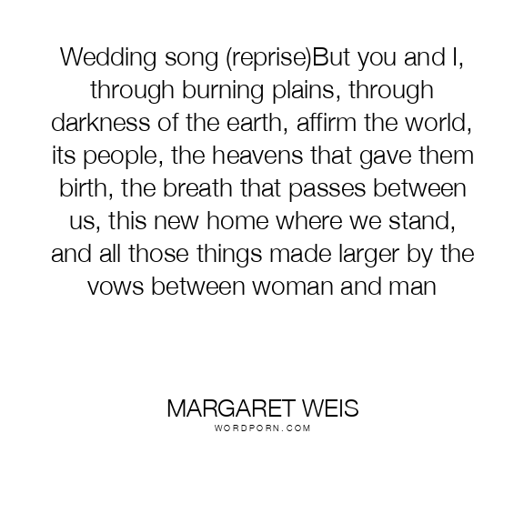 Wedding song (reprise)But you and I, through burning plains, through darkness of the earth, affirm the world, its people, the heavens that gave them birth, the breath that passes between us, this new home where we stand, and all those things made larger by the vows between woman and man