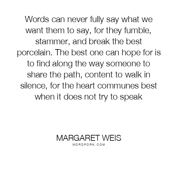 Words can never fully say what we want them to say, for they fumble, stammer, and break the best porcelain. The best one can hope for is to find along the way someone to share the path, content to walk in silence, for the heart communes best when it does not try to speak