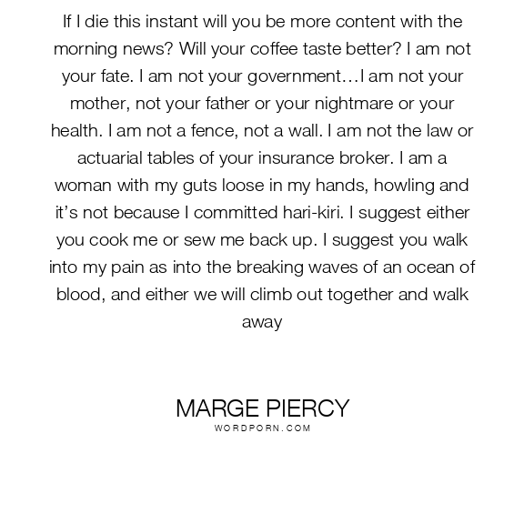 If I die this instant will you be more content with the morning news? Will your coffee taste better? I am not your fate. I am not your government…I am not your mother, not your father or your nightmare or your health. I am not a fence, not a wall. I am not the law or actuarial tables of your insurance broker. I am a woman with my guts loose in my hands, howling and it’s not because I committed hari-kiri. I suggest either you cook me or sew me back up. I suggest you walk into my pain as into the breaking waves of an ocean of blood, and either we will climb out together and walk away