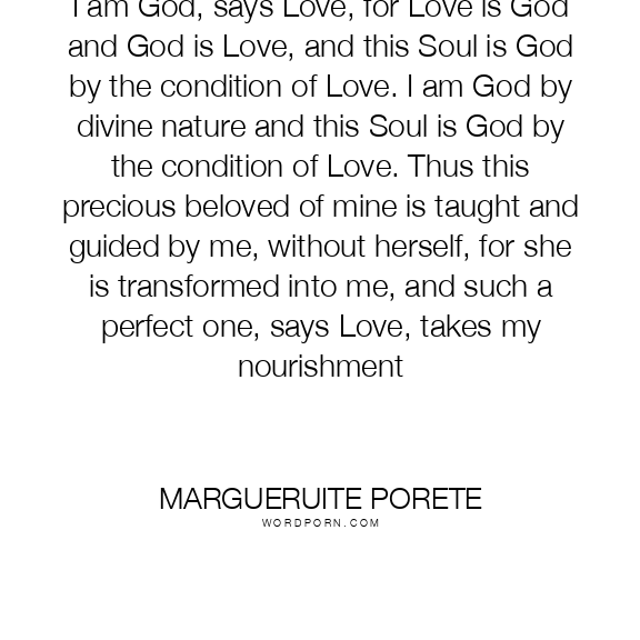 I am God, says Love, for Love is God and God is Love, and this Soul is God by the condition of Love. I am God by divine nature and this Soul is God by the condition of Love. Thus this precious beloved of mine is taught and guided by me, without herself, for she is transformed into me, and such a perfect one, says Love, takes my nourishment