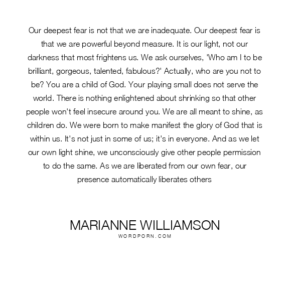 Our deepest fear is not that we are inadequate. Our deepest fear is that we are powerful beyond measure. It is our light, not our darkness that most frightens us. We ask ourselves, 'Who am I to be brilliant, gorgeous, talented, fabulous?' Actually, who are you not to be? You are a child of God. Your playing small does not serve the world. There is nothing enlightened about shrinking so that other people won't feel insecure around you. We are all meant to shine, as children do. We were born to make manifest the glory of God that is within us. It's not just in some of us; it's in everyone. And as we let our own light shine, we unconsciously give other people permission to do the same. As we are liberated from our own fear, our presence automatically liberates others
