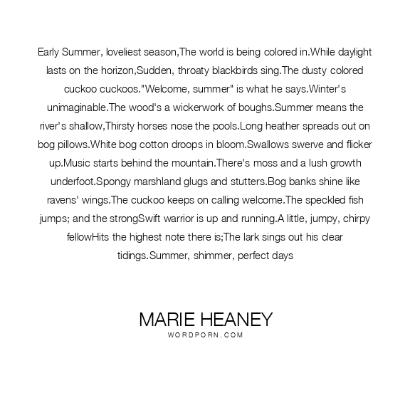 Early Summer, loveliest season,The world is being colored in.While daylight lasts on the horizon,Sudden, throaty blackbirds sing.The dusty-colored cuckoo cuckoos."Welcome, summer" is what he says.Winter's unimaginable.The wood's a wickerwork of boughs.Summer means the river's shallow,Thirsty horses nose the pools.Long heather spreads out on bog pillows.White bog cotton droops in bloom.Swallows swerve and flicker up.Music starts behind the mountain.There's moss and a lush growth underfoot.Spongy marshland glugs and stutters.Bog banks shine like ravens' wings.The cuckoo keeps on calling welcome.The speckled fish jumps; and the strongSwift warrior is up and running.A little, jumpy, chirpy fellowHits the highest note there is;The lark sings out his clear tidings.Summer, shimmer, perfect days