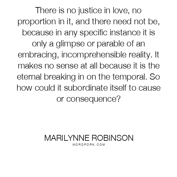 There is no justice in love, no proportion in it, and there need not be, because in any specific instance it is only a glimpse or parable of an embracing, incomprehensible reality. It makes no sense at all because it is the eternal breaking in on the temporal. So how could it subordinate itself to cause or consequence?