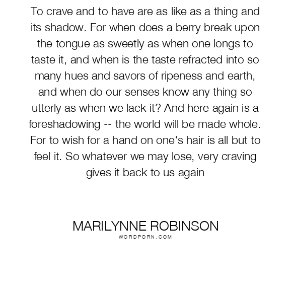 To crave and to have are as like as a thing and its shadow. For when does a berry break upon the tongue as sweetly as when one longs to taste it, and when is the taste refracted into so many hues and savors of ripeness and earth, and when do our senses know any thing so utterly as when we lack it? And here again is a foreshadowing -- the world will be made whole. For to wish for a hand on one's hair is all but to feel it. So whatever we may lose, very craving gives it back to us again
