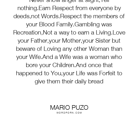 Never show anger at slight,Tell nothing.Earn Respect from everyone by deeds,not Words.Respect the members of your Blood Family.Gambling was Recreation,Not a way to earn a Living.Love your Father,your Mother,your Sister but beware of Loving any other Woman than your Wife.And a Wife was a woman who bore your Children.And once that happened to You,your Life was Forfeit to give them their daily bread