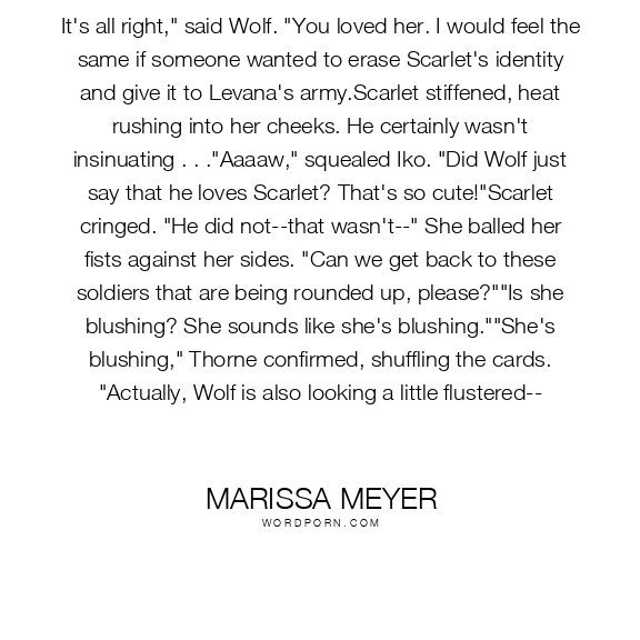 It's all right," said Wolf. "You loved her. I would feel the same if someone wanted to erase Scarlet's identity and give it to Levana's army.Scarlet stiffened, heat rushing into her cheeks. He certainly wasn't insinuating . . ."Aaaaw," squealed Iko. "Did Wolf just say that he loves Scarlet? That's so cute!"Scarlet cringed. "He did not--that wasn't--" She balled her fists against her sides. "Can we get back to these soldiers that are being rounded up, please?""Is she blushing? She sounds like she's blushing.""She's blushing," Thorne confirmed, shuffling the cards. "Actually, Wolf is also looking a little flustered--