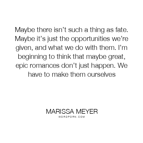 Marissa Meyer quote. Maybe there isn’t such a thing as fate. Maybe it’s just the opportunities we’re given, and what we do with them. I’m beginning to think that maybe great, epic romances don’t just happen. We have to make them ourselves