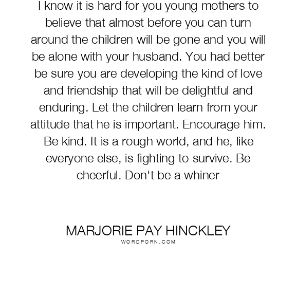 I know it is hard for you young mothers to believe that almost before you can turn around the children will be gone and you will be alone with your husband. You had better be sure you are developing the kind of love and friendship that will be delightful and enduring. Let the children learn from your attitude that he is important. Encourage him. Be kind. It is a rough world, and he, like everyone else, is fighting to survive. Be cheerful. Don't be a whiner