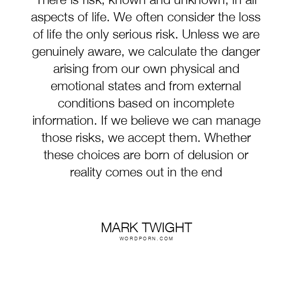 There is risk, known and unknown, in all aspects of life. We often consider the loss of life the only serious risk. Unless we are genuinely aware, we calculate the danger arising from our own physical and emotional states and from external conditions based on incomplete information. If we believe we can manage those risks, we accept them. Whether these choices are born of delusion or reality comes out in the end