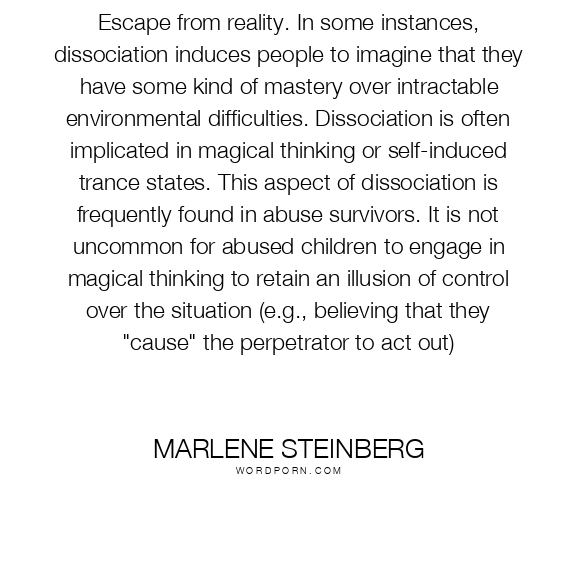 Escape from reality. In some instances, dissociation induces people to imagine that they have some kind of mastery over intractable environmental difficulties. Dissociation is often implicated in magical thinking or self-induced trance states. This aspect of dissociation is frequently found in abuse survivors. It is not uncommon for abused children to engage in magical thinking to retain an illusion of control over the situation (e.g., believing that they "cause" the perpetrator to act out)