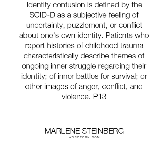 Identity confusion is defined by the SCID-D as a subjective feeling of uncertainty, puzzlement, or conflict about one's own identity. Patients who report histories of childhood trauma characteristically describe themes of ongoing inner struggle regarding their identity; of inner battles for survival; or other images of anger, conflict, and violence. P13