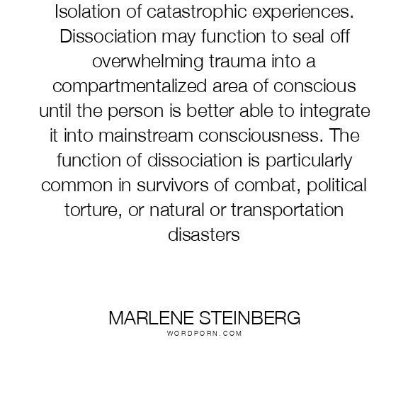 Isolation of catastrophic experiences. Dissociation may function to seal off overwhelming trauma into a compartmentalized area of conscious until the person is better able to integrate it into mainstream consciousness. The function of dissociation is particularly common in survivors of combat, political torture, or natural or transportation disasters