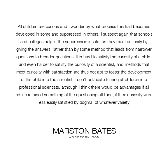 All children are curious and I wonder by what process this trait becomes developed in some and suppressed in others. I suspect again that schools and colleges help in the suppression insofar as they meet curiosity by giving the answers, rather than by some method that leads from narrower questions to broader questions. It is hard to satisfy the curiosity of a child, and even harder to satisfy the curiosity of a scientist, and methods that meet curiosity with satisfaction are thus not apt to foster the development of the child into the scientist. I don't advocate turning all children into professional scientists, although I think there would be advantages if all adults retained something of the questioning attitude, if their curiosity were less easily satisfied by dogma, of whatever variety