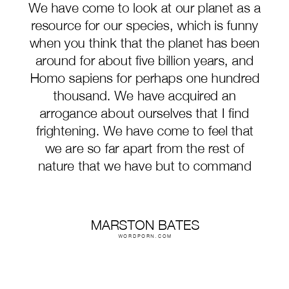 We have come to look at our planet as a resource for our species, which is funny when you think that the planet has been around for about five billion years, and Homo sapiens for perhaps one hundred thousand. We have acquired an arrogance about ourselves that I find frightening. We have come to feel that we are so far apart from the rest of nature that we have but to command