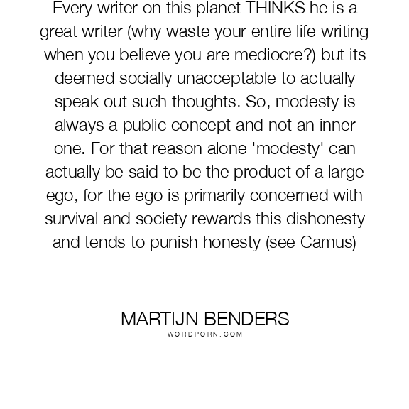 Every writer on this planet THINKS he is a great writer (why waste your entire life writing when you believe you are mediocre?) but its deemed socially unacceptable to actually speak out such thoughts. So, modesty is always a public concept and not an inner one. For that reason alone 'modesty' can actually be said to be the product of a large ego, for the ego is primarily concerned with survival and society rewards this dishonesty and tends to punish honesty (see Camus)
