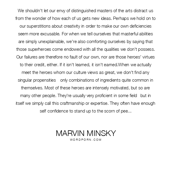 We shouldn't let our envy of distinguished masters of the arts distract us from the wonder of how each of us gets new ideas. Perhaps we hold on to our superstitions about creativity in order to make our own deficiencies seem more excusable. For when we tell ourselves that masterful abilities are simply unexplainable, we're also comforting ourselves by saying that those superheroes come endowed with all the qualities we don't possess. Our failures are therefore no fault of our own, nor are those heroes' virtues to their credit, either. If it isn't learned, it isn't earned.When we actually meet the heroes whom our culture views as great, we don't find any singular propensities––only combinations of ingredients quite common in themselves. Most of these heroes are intensely motivated, but so are many other people. They're usually very proficient in some field--but in itself we simply call this craftmanship or expertise. They often have enough self-confidence to stand up to the scorn of peers--but in itself, we might just call that stubbornness. They surely think of things in some novel ways, but so does everyone from time to time. And as for what we call "intelligence", my view is that each person who can speak coherently already has the better part of what our heroes have. Then what makes genius appear to stand apart, if we each have most of what it takes?I suspect that genius needs one thing more: in order to accumulate outstanding qualities, one needs unusually effective ways to learn. It's not enough to learn a lot; one also has to manage what one learns. Those masters have, beneath the surface of their mastery, some special knacks of "higher-order" expertise, which help them organize and apply the things they learn. It is those hidden tricks of mental management that produce the systems that create those works of genius. Why do certain people learn so many more and better skills? These all-important differences could begin with early accidents. One child works out clever ways to arrange some blocks in rows and stacks; a second child plays at rearranging how it thinks. Everyone can praise the first child's castles and towers, but no one can see what the second child has done, and one may even get the false impression of a lack of industry. But if the second child persists in seeking better ways to learn, this can lead to silent growth in which some better ways to learn may lead to better ways to learn to learn. Then, later, we'll observe an awesome, qualitative change, with no apparent cause--and give to it some empty name like talent, aptitude, or gift