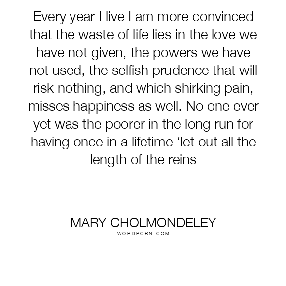 Every year I live I am more convinced that the waste of life lies in the love we have not given, the powers we have not used, the selfish prudence that will risk nothing, and which shirking pain, misses happiness as well. No one ever yet was the poorer in the long run for having once in a lifetime ‘let out all the length of the reins