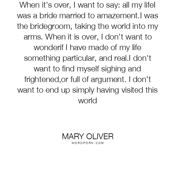 When it's over, I want to say: all my lifeI was a bride married to amazement.I was the bridegroom, taking the world into my arms. When it is over, I don't want to wonderif I have made of my life something particular, and real.I don't want to find myself sighing and frightened,or full of argument. I don't want to end up simply having visited this world