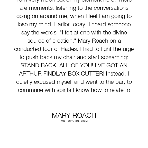 Mary Roach quote. I am very much out of my element here. There are moments, listening to the conversations going on around me, when I feel I am going to lose my mind. Earlier today, I heard someone say the words,