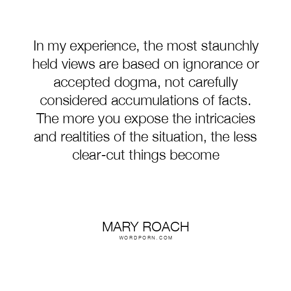 Mary Roach quote. In my experience, the most staunchly held views are based on ignorance or accepted dogma, not carefully considered accumulations of facts. The more you expose the intricacies and realtities of the situation, the less clear-cut things become