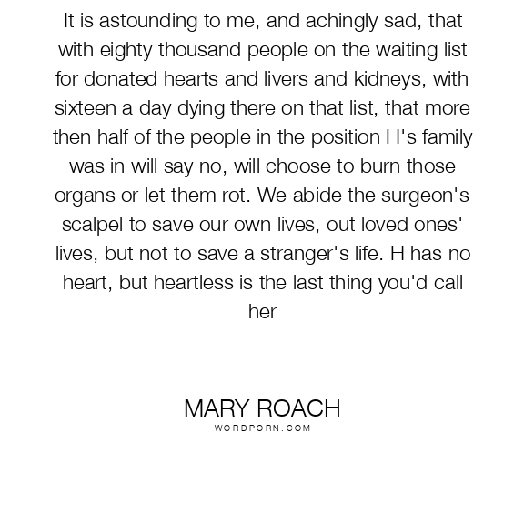 Mary Roach quote. It is astounding to me, and achingly sad, that with eighty thousand people on the waiting list for donated hearts and livers and kidneys, with sixteen a day dying there on that list, that more then half of the people in the position H's family was in will say no, will choose to burn those organs or let them rot. We abide the surgeon's scalpel to save our own lives, out loved ones' lives, but not to save a stranger's life. H has no heart, but heartless is the last thing you'd call her
