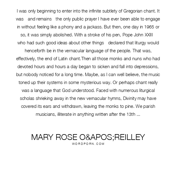 I was only beginning to enter into the infinite subtlety of Gregorian chant. It was - and remains - the only public prayer I have ever been able to engage in without feeling like a phony and a jackass. But then, one day in 1965 or so, it was simply abolished. With a stroke of his pen, Pope John XXIII - who had such good ideas about other things - declared that liturgy would henceforth be in the vernacular language of the people. That was, effectively, the end of Latin chant.Then all those monks and nuns who had devoted hours and hours a day began to sicken and fall into depressions, but nobody noticed for a long time. Maybe, as I can well believe, the music toned up their systems in some mysterious way. Or perhaps chant really was a language that God understood. Faced with numerous liturgical scholas shrieking away in the new vernacular hymns, Divinity may have covered its ears and withdrawn, leaving the monks to pine. We parish musicians, illiterate in anything written after the 13th century, stumbled around trying to score liturgies for guitar and bongo drums, trying to make sense of texts like "Eat his body! Drink his blood!"It wasn't because the music got so bad that I quit going to Mass, but it certainly was the beginning of my doubts about papal infallibility